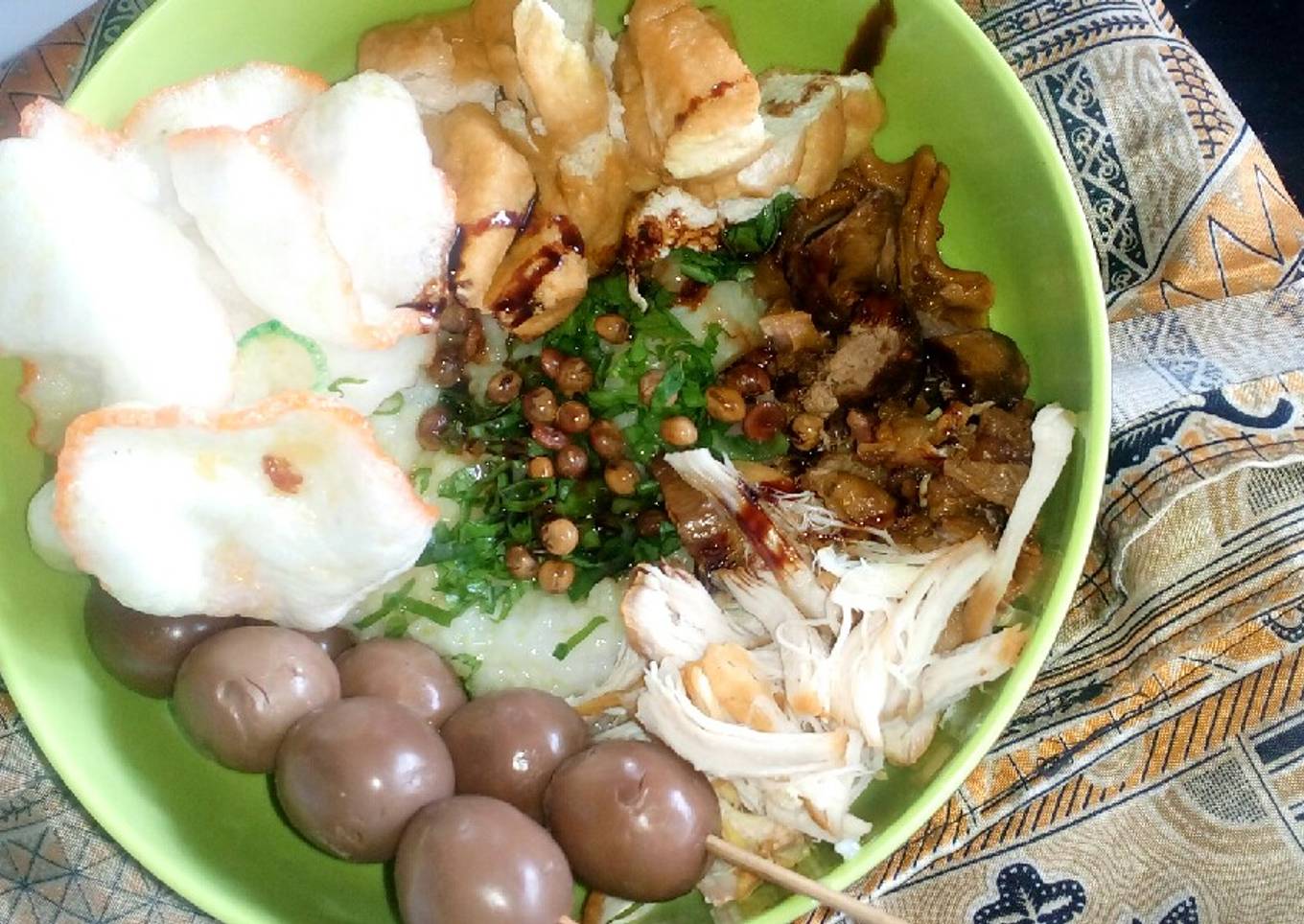 - Penyajian : ambil bubur ke dalam mangkuk, beri kuah kuning 1-2 centong sayur, beri bahan taburan seperti gambar diatas.